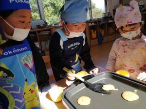 4. ホットケーキを裏返します。初めは保育士と一緒にひっくり返し、2度目は子どもだけでひっくり返してみました。おいしそうな色に焼きあがりました。一人一人お皿に移してもちもちパンケーキのできあがりです!