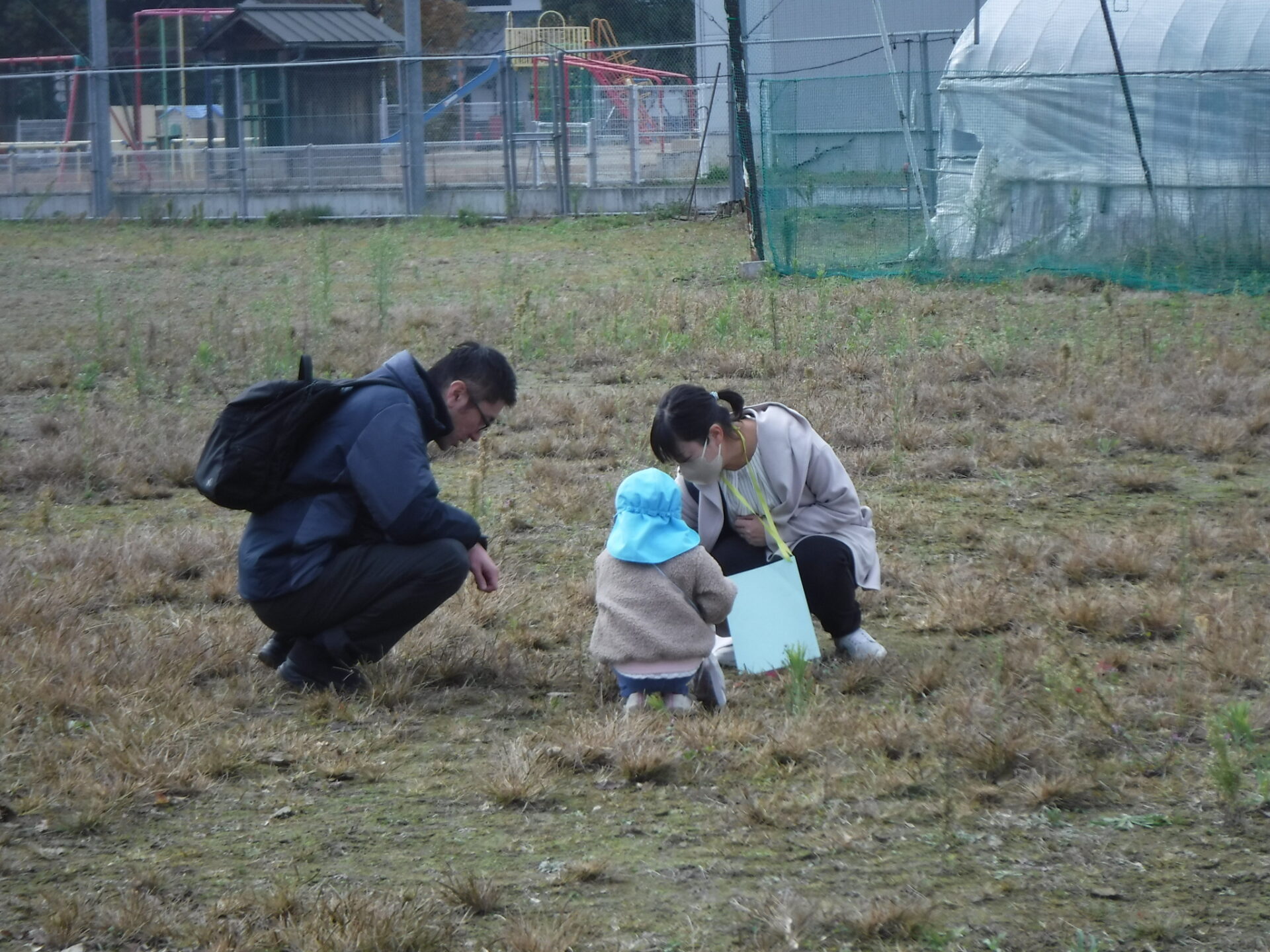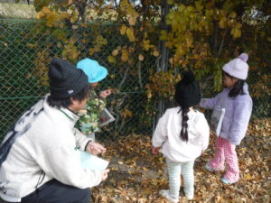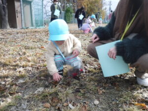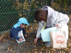 お家の方と一緒に、秋の自然物の中で探索する楽しさや色づいた木の葉を