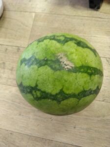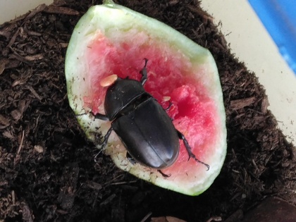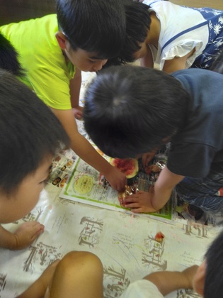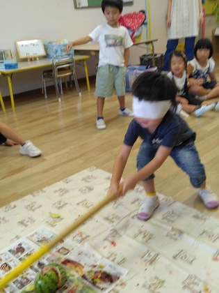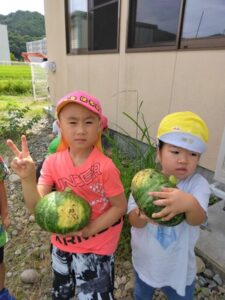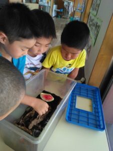 今年の暑さも厳しく、メロンやスイカはなかなか育ちませんでした。それでも、すいかは1つ実をつけました。「みんなで食べるには、小さいな」と話していると、「スイカ割りしよう!」との提案。スイカ割り大会が始まりました。割ったあとは、種を取り、ちょうど友達が持ってきてくれたカブトムシに食べてもらうことになりました。種を頭に乗せて夢中で食べるカブトムシの姿に、「おいしいんだね」と、じ〜っと見つめる子どもたちでした。1つのスイカから、様々な経験ができました。