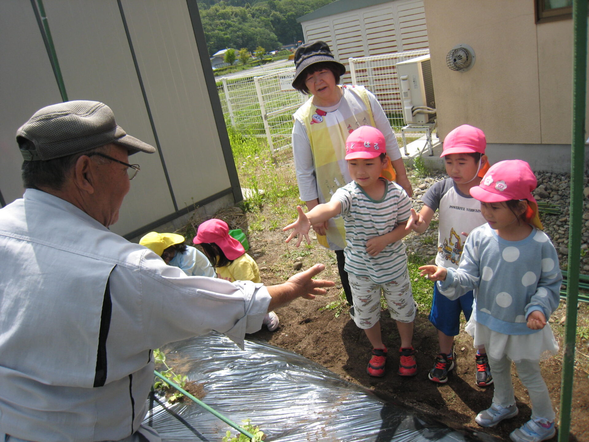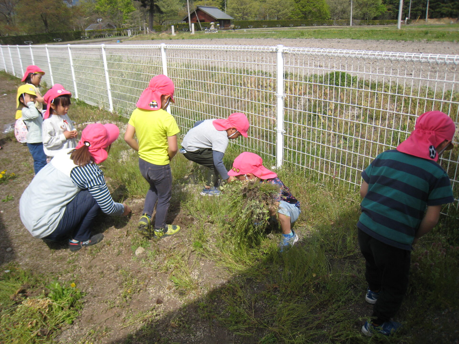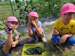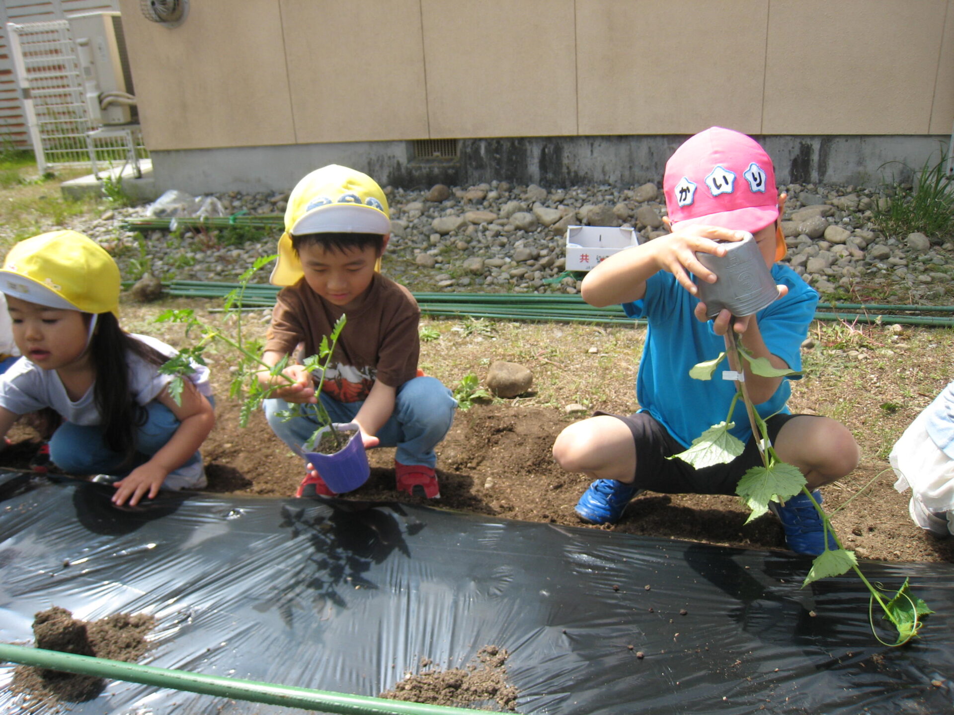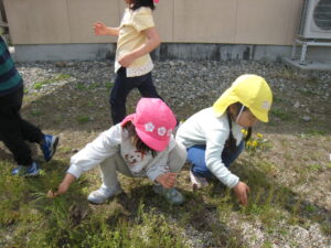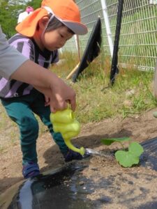 今年も、保育園の裏の畑での野菜作りが始まりました。年長を中心に野菜会議を開きました。年少・年中にも相談し、今年の野菜が決まりました。かぼちゃ、きゅうり、とまと、なす、枝豆、おくら、すいか、めろん、ミニトマト、紫ミニトマトです。図鑑で見つけた紫トマトを「絶対作りたい!」と、楽しみにしています。まずは、草取りからスタート!
