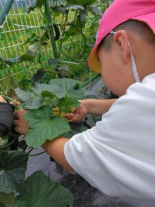 毎日、観察する中で大きくなった葉っぱや形、ざらざらした感触に気づく子どもたち。花が咲き、野菜によって色や形の違いがあったり、匂いも嗅いでみました。目や鼻、耳、口、手などすべてを使って成長を感じ、いろいろな発見をしていました。