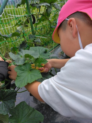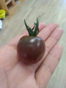 毎日世話をして、観察。大きくなった葉っぱ、つるが出てきてこと、花の色や香り、いろいろなことに興味を持ち確かめて見る子どもたちです。さあ、いよいよ収穫です!!紫トマトが日に日に色濃くなる様子に、「もういいかな?」とにらめっこ。色の濃さにびっくりでした。