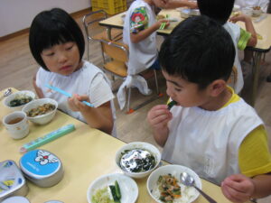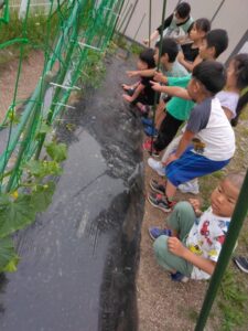 給食で味わいました。「いつも食べているトマトやきゅうりより味が濃い」「トマト食べられた!」様々な声が聞かれました。紫ミニトマトの味は、「すっぱい」「めっちゃ、あまい!」と、それぞれ感じ方は違うようでした。ナス、おくらは味噌汁へ、きゅうりは浅漬けや味噌マヨでいただきました。