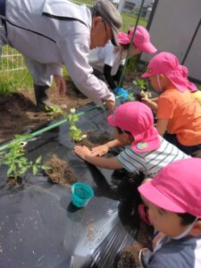 いよいよ、苗を植えていきます。おじいちゃん先生に教えてもらいながら、優しく植えていきます。「これが、トマトになるのか〜」「大きくな〜れ」「おいしくな〜れ」。