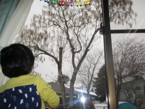 未満児のクラスは巣箱に近くて、小鳥に気付かれずに室内から観察できる、絶好のバードウォッチングポイントでした!