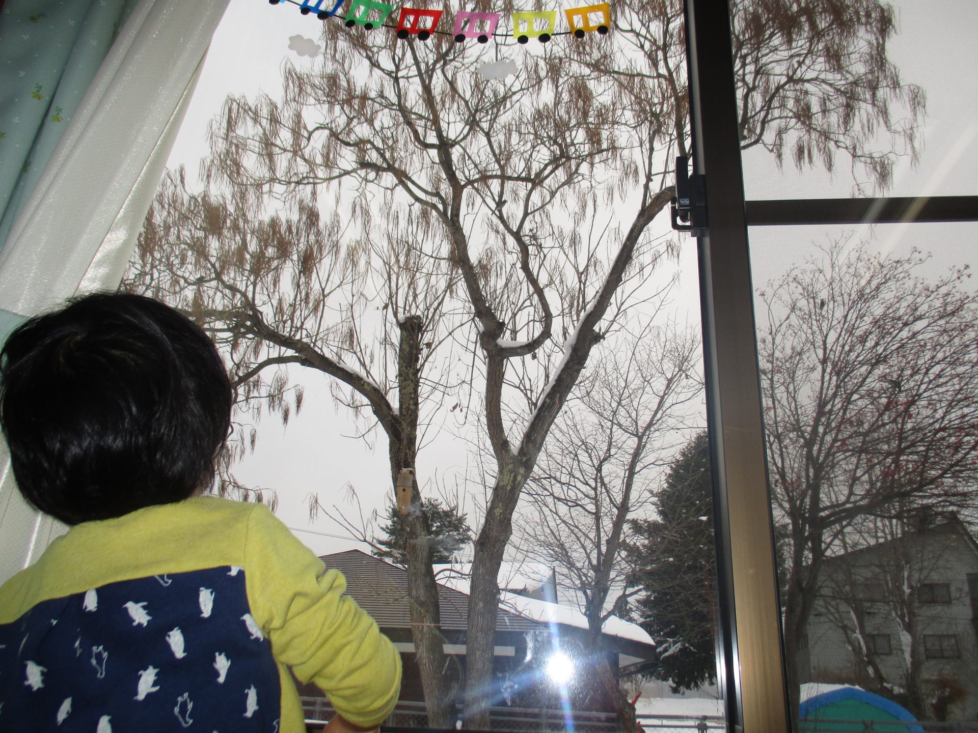 以前、小鳥が保育園の巣箱に来ているのを見つけてから、子どもたちはときどき巣箱の木を気にしてみていました。