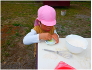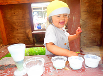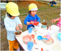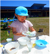 ・遊びを進めて行くと色のついた泡を作りたくなる事を予想したが、色つけできる物が周りにあることに気づいたり、それらをどう使うか工夫したり試したりしてほしいと願い絵の具を出さず見守ることにした。草花をこすって色を出したり、ちぎって混ぜたりすることは予想していたが、泡に泥で絵を描いた子どもの発想には本当にびっくりした。これからも砂、土、草花など身近な自然物を遊びに取り入れ、出来上がっていく過程や変化を楽しんでほしいと思う。