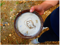 赤土に水を混ぜ、トロトロにして作ったチョコレートを小枝につけて模様をつけて作った