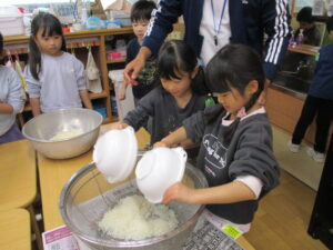 水は冷たいし、洗ったお米は手にくっついちゃう。大変なんだな。