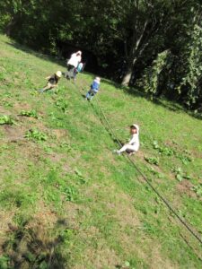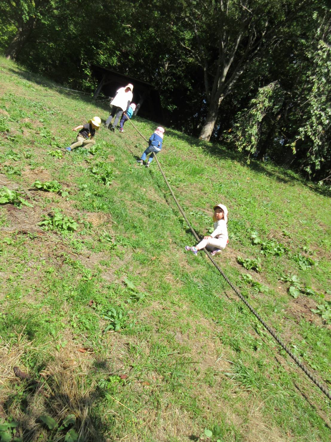 築山を下りるときは、足にブレーキをかけたり、お尻をついたりしてみんな自分で上手に下りていきます