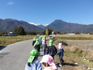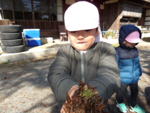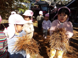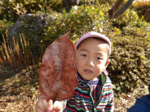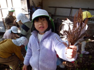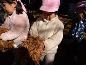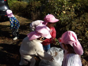 みんなで落ち葉を探したり拾ったりして、たくさんの落ち葉を集めることができ、「これで焼き芋出来るね!」と、焼き芋会への期待を高めることができました。焼き芋会では、自分たちで育てて収穫したさつまいもを、みんなで集めた落ち葉を使って焼きます。収穫の喜びを味わったり、友達と一緒に活動することで、「みんなでやる楽しさ」や「協力する気持ち」も育って欲しいと感じます。