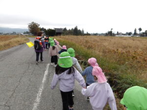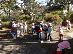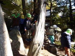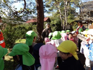 今年も、落ち葉集めに行かせてほしいとお伝えすると、快く承諾いただき、年少〜年長の子ども達で出かけました。