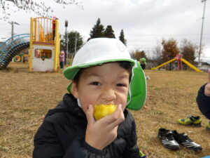 子ども達が育てた畑のさつまいもを収穫し、自分たちで落ち葉を集めて準備した焼き芋はとても美味しくできました。