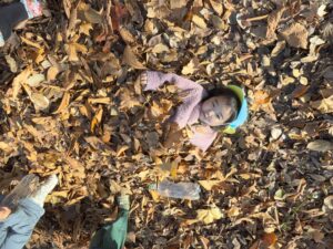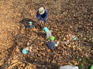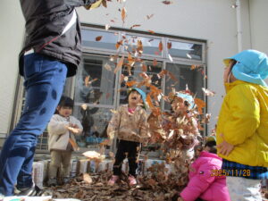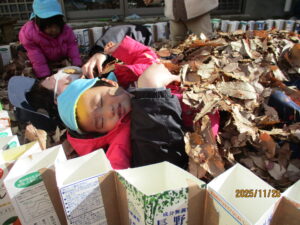 園で遊んだ落ち葉遊びがきっかけで、子どもたちの中で落ち葉を布団にする等の新しい遊び方を発見し、一緒に秋の自然を楽しめたことがうれしかったです。