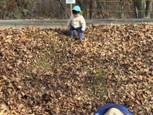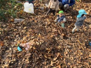 1.2歳児クラスのつくし組が、散歩で集めてきた落ち葉を園庭に広げてくれました。