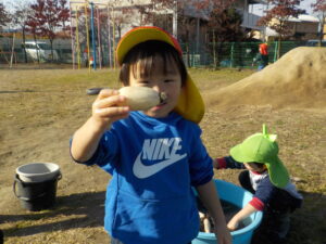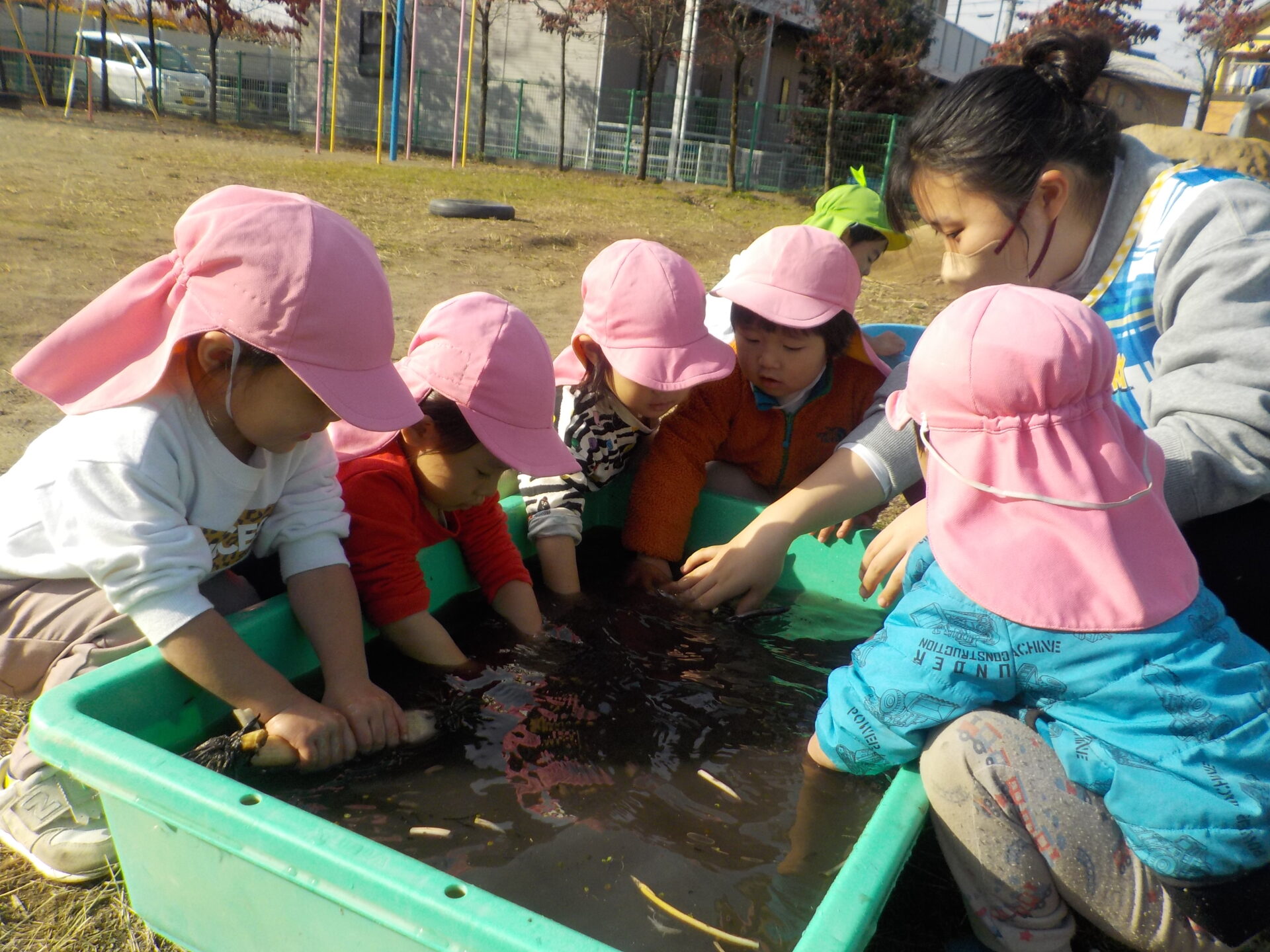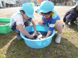 地域の方が温泉のお湯を持ってきてくださったので、掘ったレンコンをお湯で洗いました。冷たい思いをしなくてよかったです。未満児さんも興味を持って一生懸命洗ってくれました。