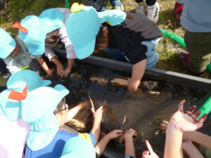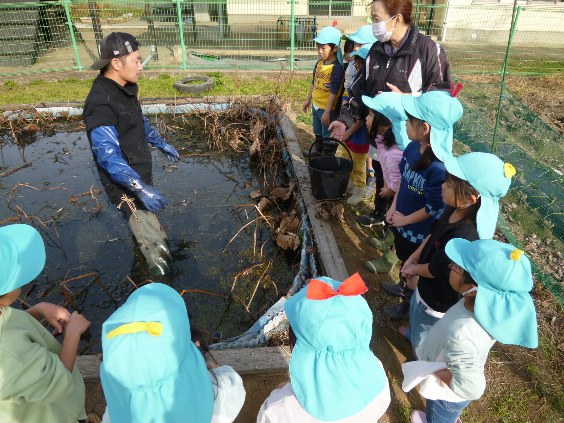 水の中を手探りでレンコンを探していると子どもたちが「どこにあるの?」地域の方「なかなかわからないんだよ~」と手探りで泥水の中を探し掘ってくれました。