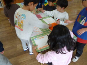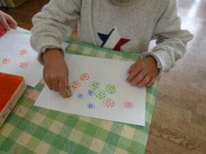 掘ったときの小さいレンコンを使って子どもたちが「レンコンでスタンプがしたい!」と言ったので、スタンプ遊びをしました。