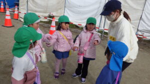 ・つるつるピカピカのどんぐりがたくさん落ちていて、年少児はきれいなどんぐりを選んで拾っていました。芽がが出ているどんぐりは「しっぽがはえとる!」と見てはポイッとしていました。丸い形が欲しかったようです。