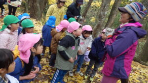 学友林に入ると空気がピンッと張り詰めた感じがして、落ち葉を踏みしめる子ども達の足元から「カサカサ」良い音が聞こえました。