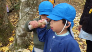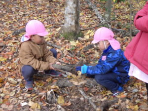 ・「サルノコシカケ、まだあってよかった~」今年度は春先に出かけた際、サルノコシカケが大量に木に生えており子ども達はそれを取りたくて工夫していたことがありました。そのことが思い出されたのでしょう。