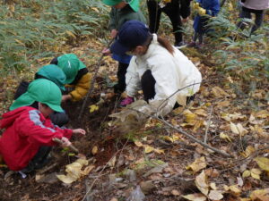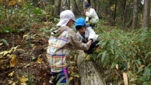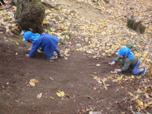 そんな中で年長児何人かは、最近熱中している鬼ごっこを「鬼ごっこやる人ー?」「やるやる~」と集合し斜面や山道を木々や友だちを避けながら走り回って鬼ごっこを楽しんでいました。