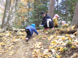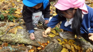 落ち葉の下や朽ちた木の陰から何かを発見したり、自然物を使ってお料理したり、触ってみたり匂ってみたりしながら、学友林のいたる所で夢中になって遊びました。