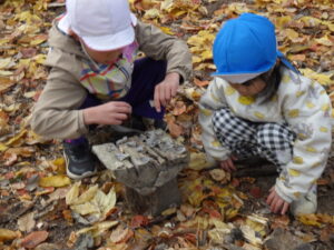 ・年長児は「この木はトンカチみたい」など枝を道具に見立てて使って遊んでいた。学友林の一角にその枝達を道具置き場として隠していました。後日出掛けた時は、そこから持ってきて道具として遊んでいました。