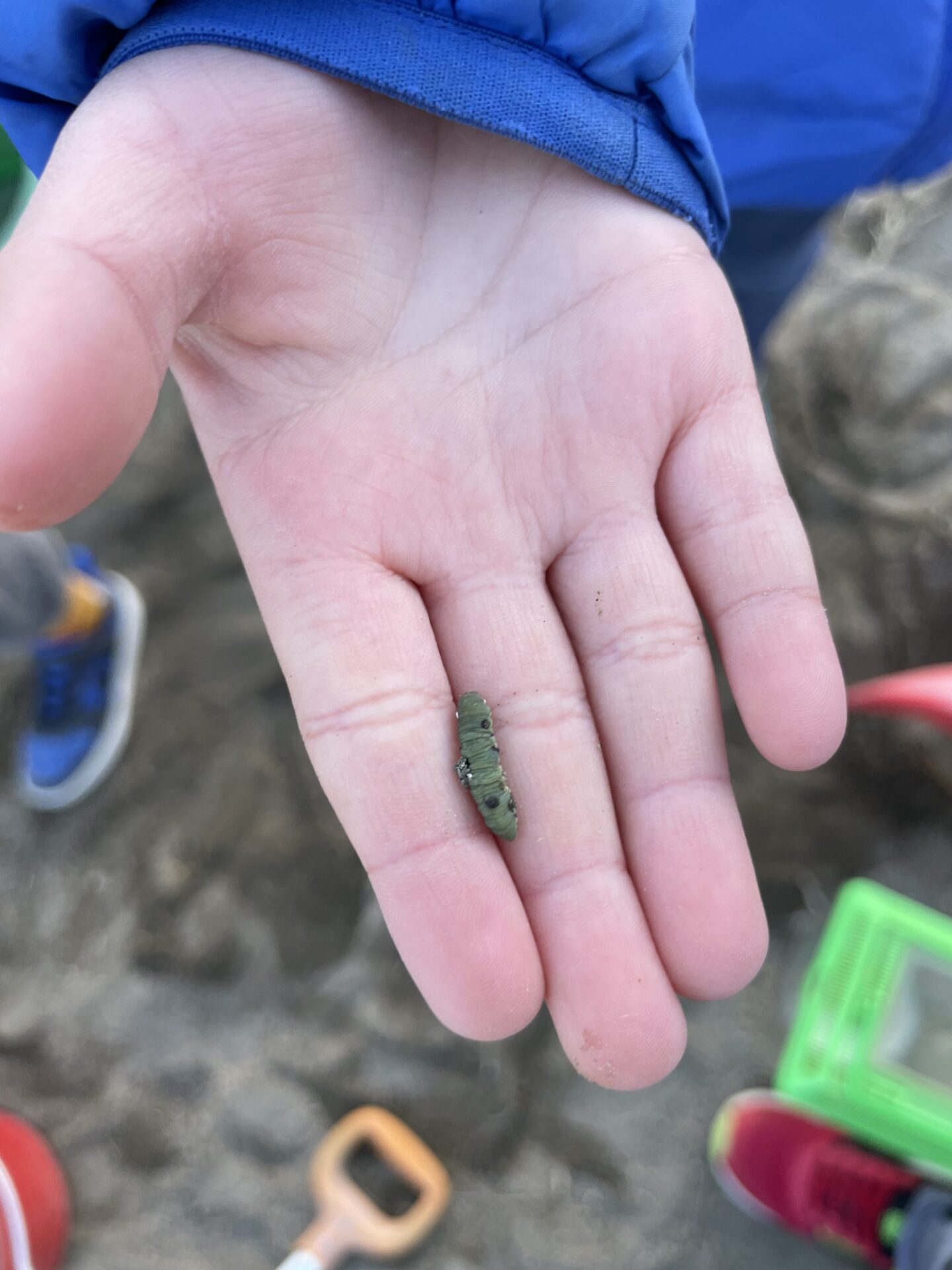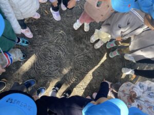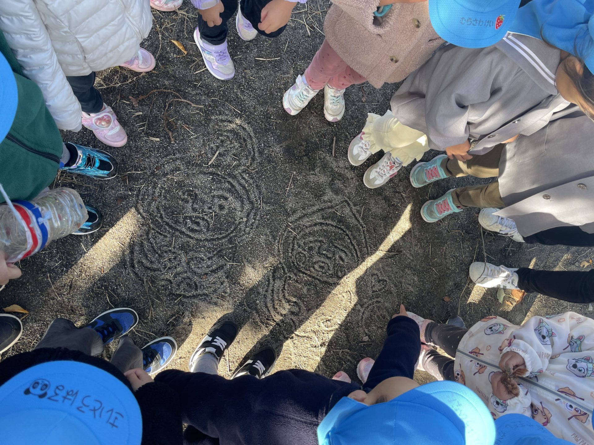 途中、公園の砂場で見つけたコビトの絵に大興奮!!