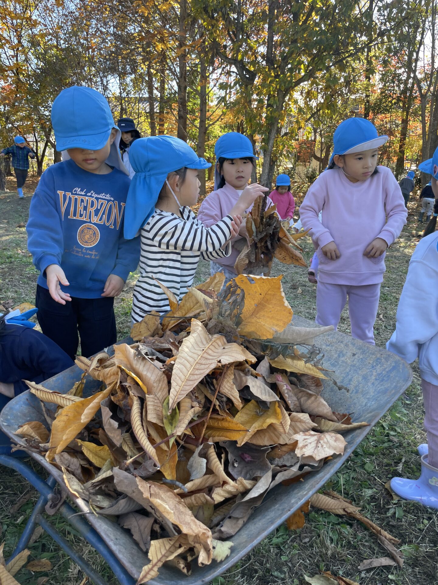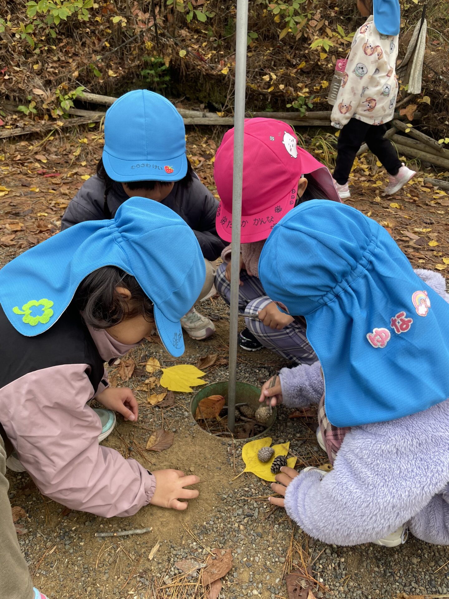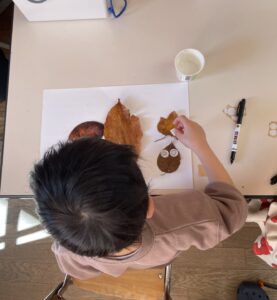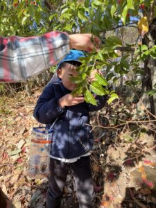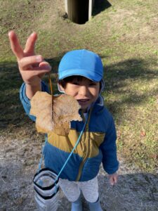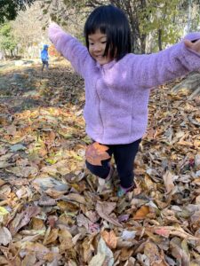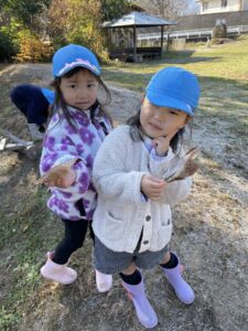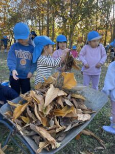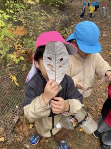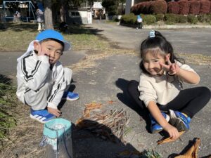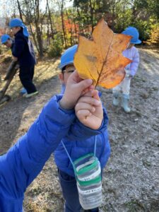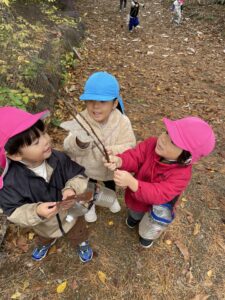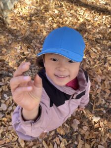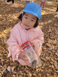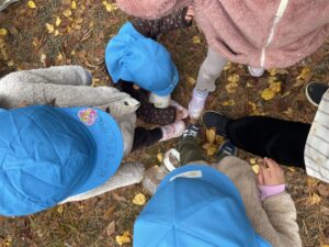 天気が良い日はお散歩に行き、落ち葉や木の実、松ぼっくりやススキなど、秋の自然物を見たり触ったりして楽しむ子どもたち。その中で他の学年との交流もあり、”小さい子と歩くときは道路側を歩こう” “年少さん笑ってる!可愛い♡” “年長さんの手が大きくてかっこいい!” などなど、色々な発見をしながら、思いやりや優しい気持ちが育ってきているように感じました。
