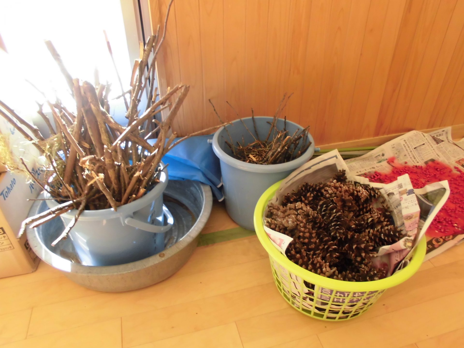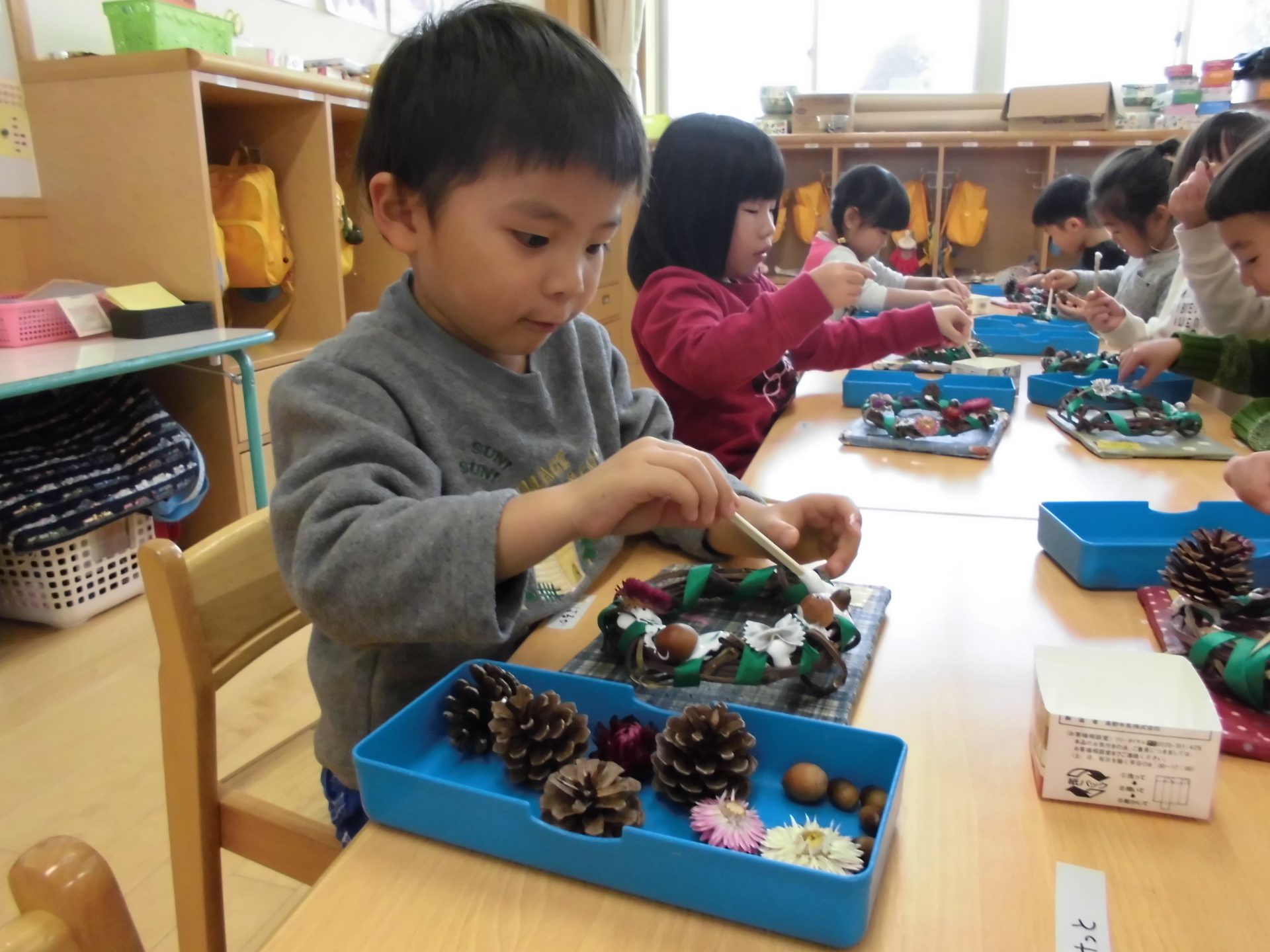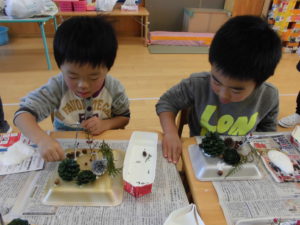 ・年長さんは、運動会や畑活動から続いている活動でした。まつぼっくりツリーの土台を見つけて「これ、運動会で使った¨竹太鼓¨の竹?」「畑の大豆の豆殻やお豆も使えるんだ」と感心したり、作るのに苦労した松ぼっくりツリーですが、「どうやったら・・・」と考えながらツリーを横に倒してみたり、「それいいね」「これも使ってみたら」と友だち同士で見合い、お互いの良いところを吸収しながら夢中で取り組む姿がありました。年長さんはお正月飾りも運動会の竹で作っていました。