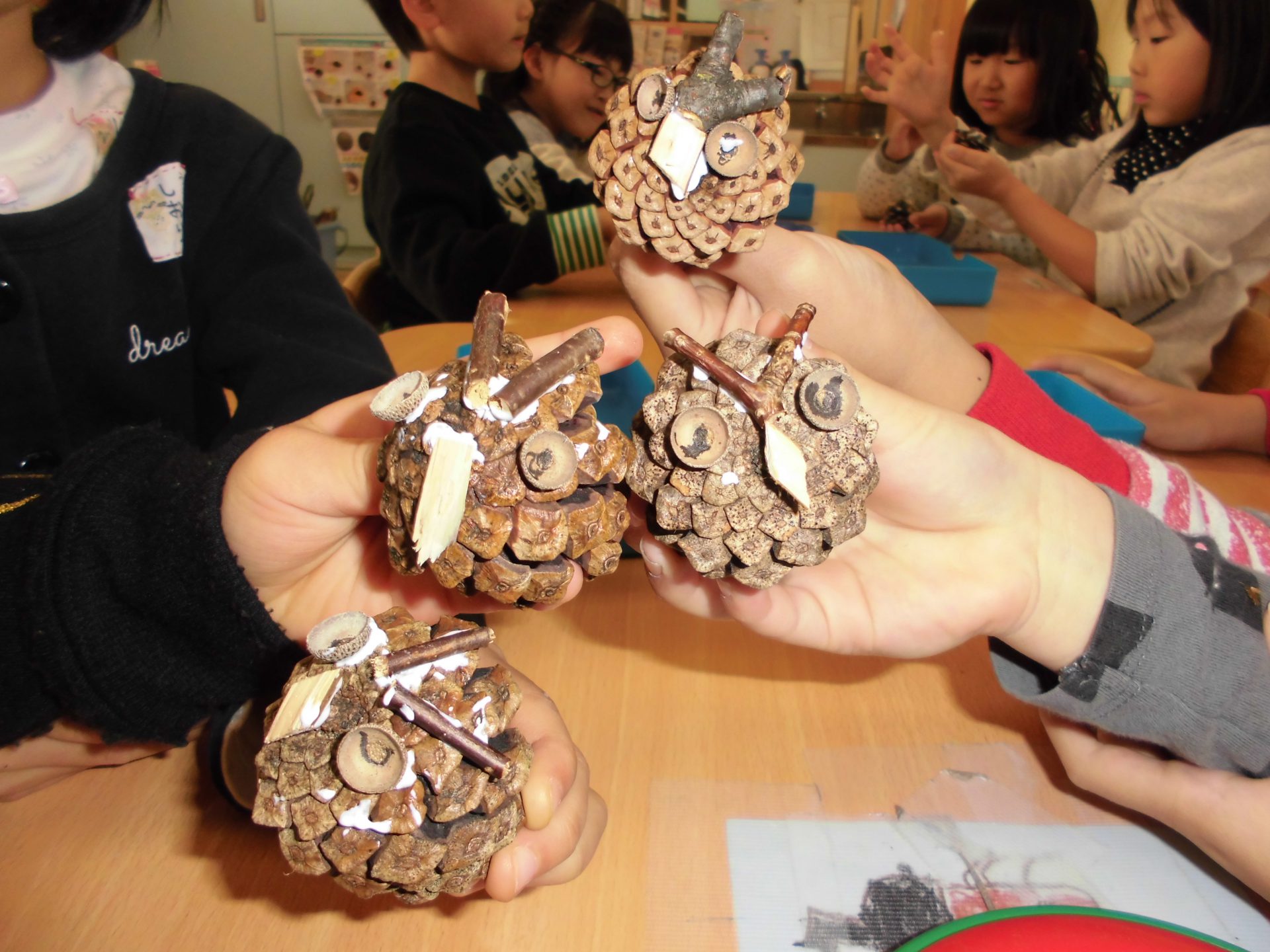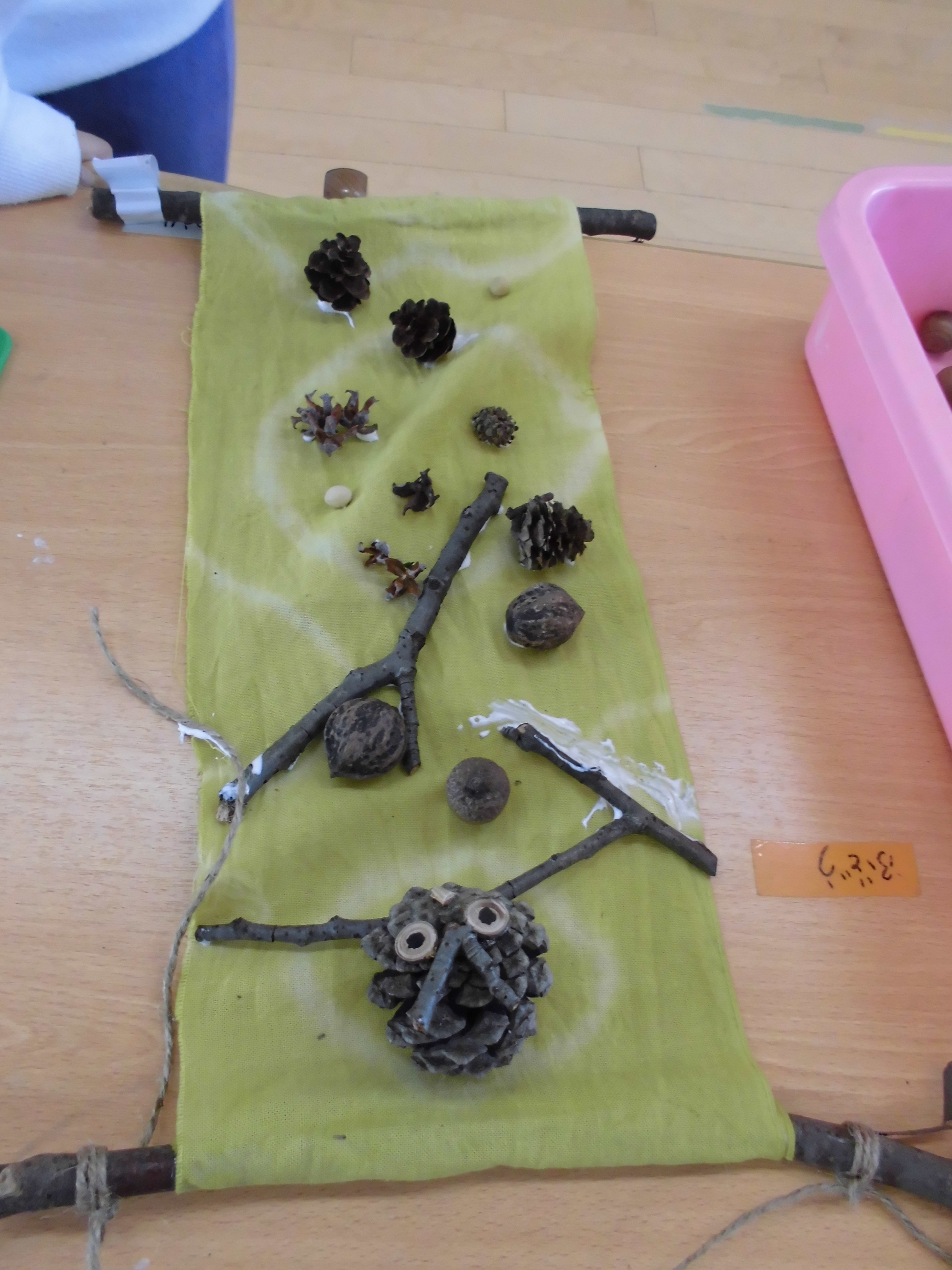 秋に園庭のマリーゴールドで染めた布を運動会のバンダナにしました。バンダナの再利用でタペストリーを作ってみました。お散歩で拾った松ぼっくりで『フクロウ』を作って飾ったよ!!自由に木の実を飾って、個性的なタペストリーができました。なんと、目や角?まで切り株と小枝で出来ています。