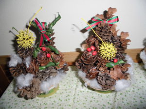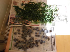 ¨まつぼっくりツリー¨が完成しました。畑の枝豆の殻と中身の大豆を赤と緑に染めて、ツリーの土台は、またまた再利用・・・運動会のリズムで年長さんがたたいた竹太鼓の竹を切って使っています「あれ!この竹、運動会でも使った?」ですって・・・でも「ほんとの、ツリーみたいでしょ!」