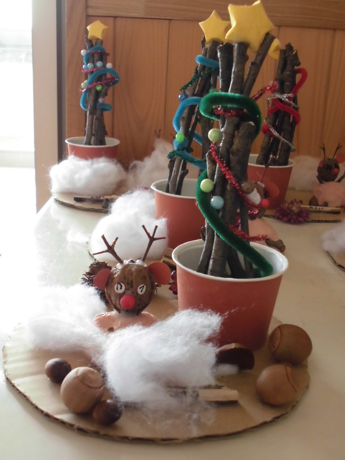 そして、もうひとつ・・・小枝をモールでまとめただけのシンプルなツリーとお散歩で拾ったクルミがトナカイのオブジェに変身です。トナカイの角は小枝、かわいいでしょ!!