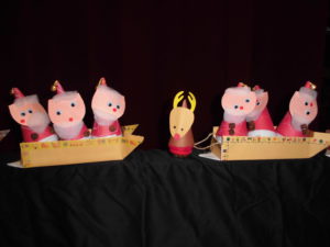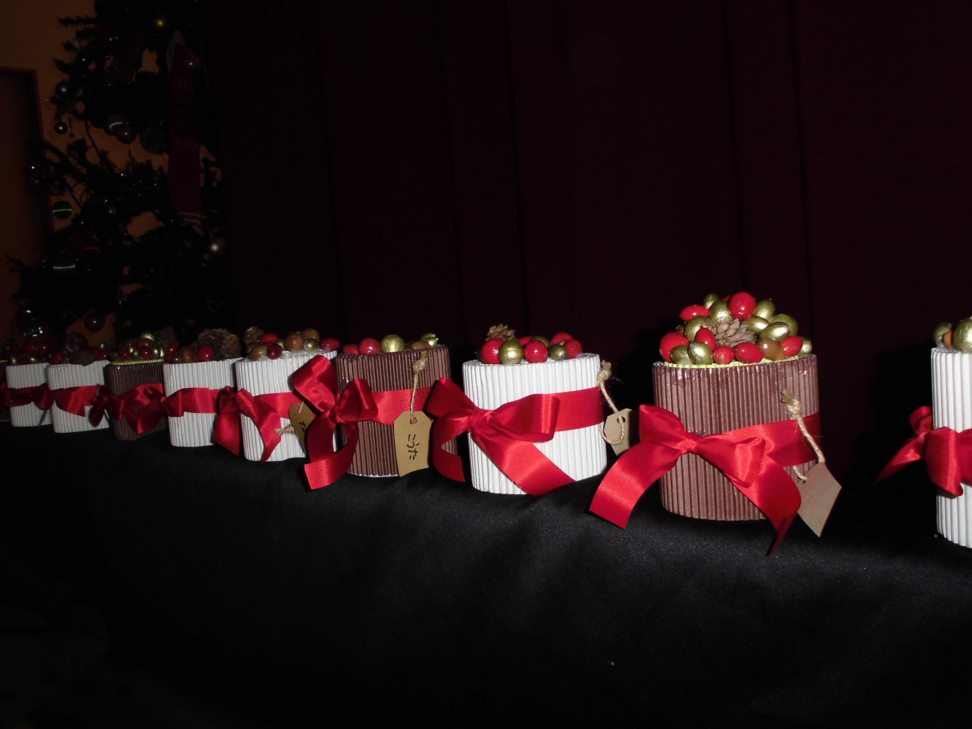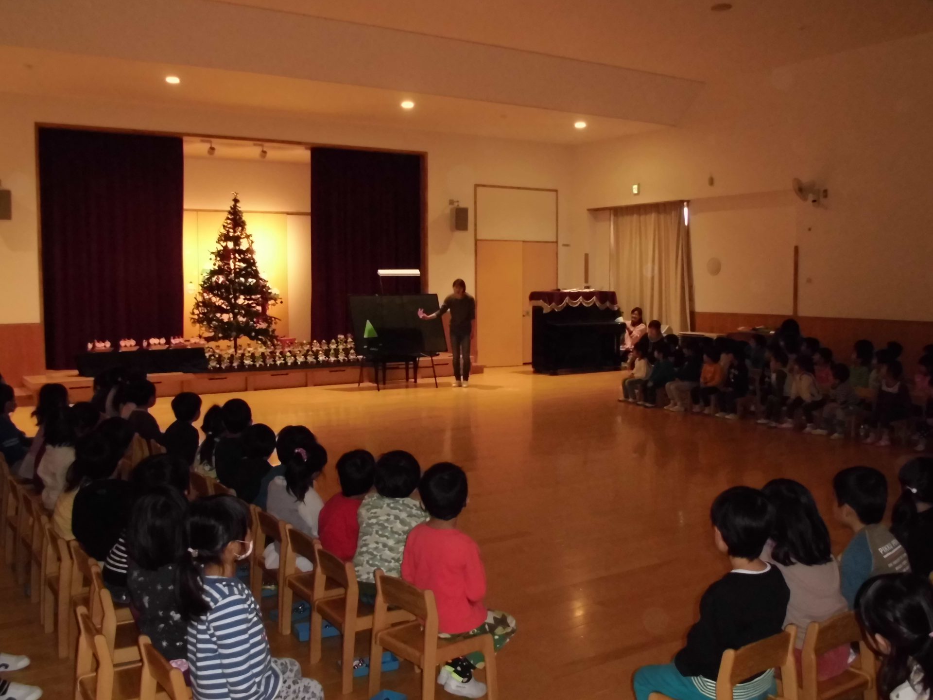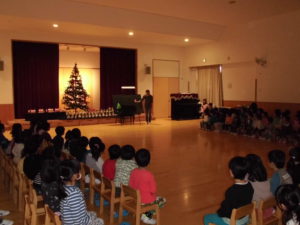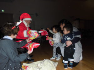 そしてクリスマス会当日・・・子ども達の作品に囲まれ、各学年の歌や手遊びの出し物の後、待ちに待った“サンタさん”が登場子ども達は大興奮でした。未満児さんから順番に一人ひとりプレゼントを手渡しされ・・・