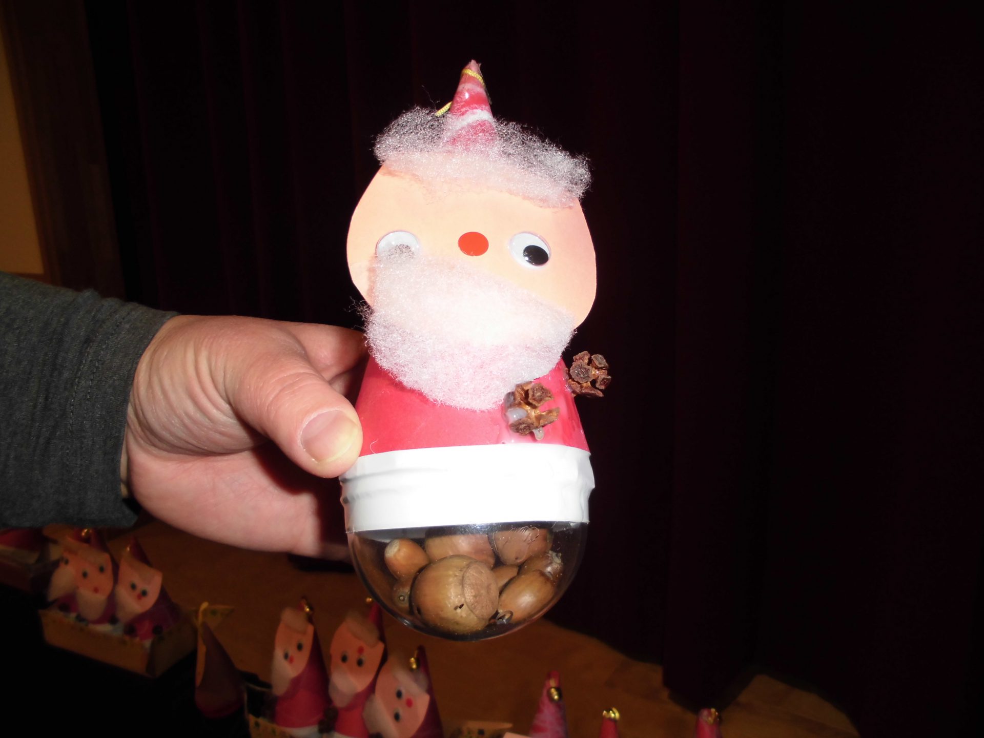 おきあがりこぼしのサンタです。ガチャガチャの空きケースに自分でどんぐりを入れました。ガラガラと振るとマラカスにもなります!サンタさんの洋服のボタンも杉の実で出来ているんですよ!!