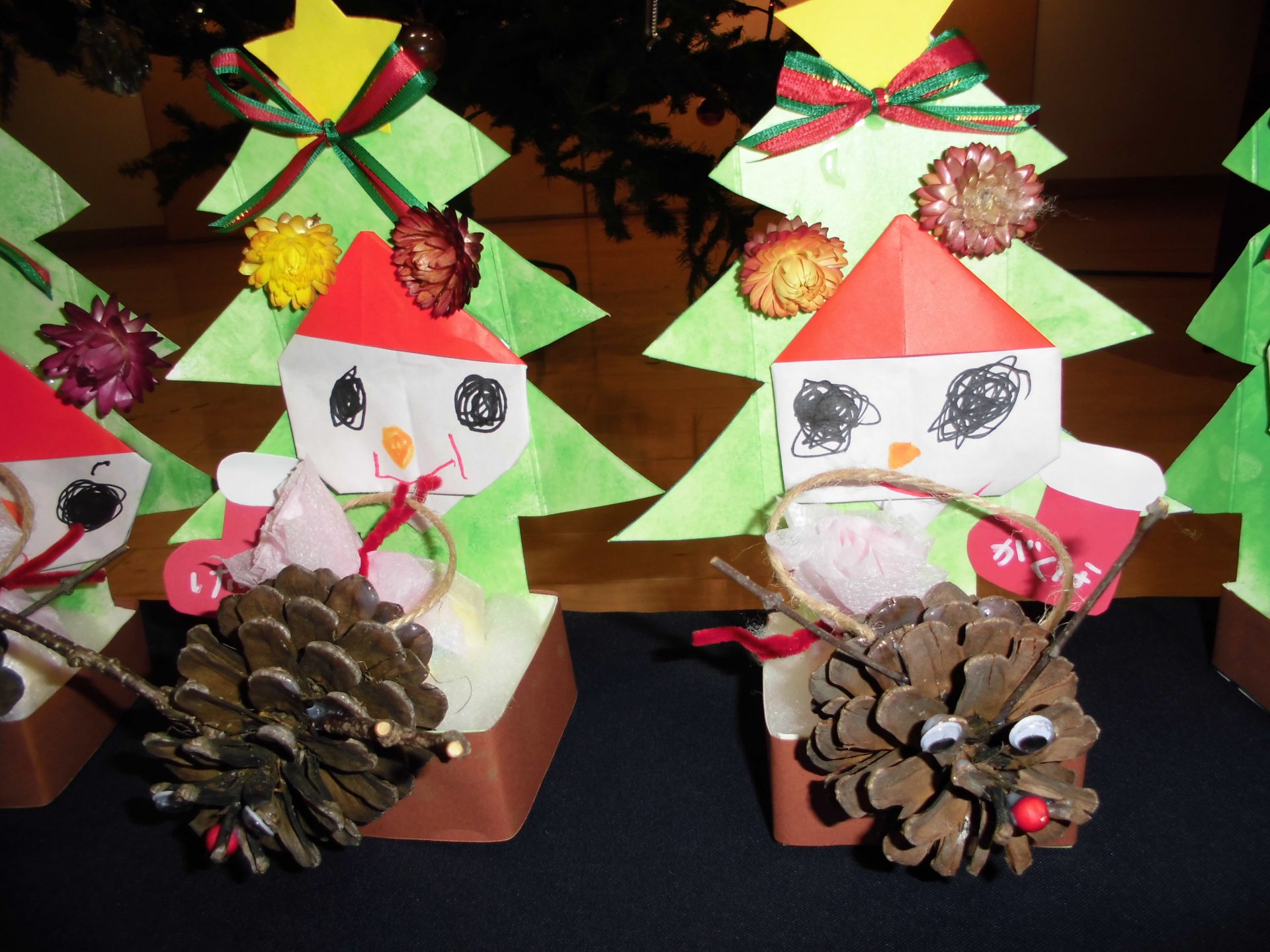 お散歩で拾った松ぼっくりのトナカイと貝細工の花のツリー、そして「笑っているサンタさん」だそうです。