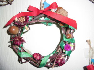 ・クリスマス・・・って「サンタさんから、プレゼントをもらう日」そして、ツリーを飾って、ケーキを食べてパーティーするんだ・・・と答える子ども達。そんな、家族団らんで過ごすクリスマスも素敵ですが、園ではお散歩で拾った様々な木の実や小枝・畑で収穫した作物などを使い、自分でクリスマスのリースやオブジェを作ります。糊で手がベトベトになったり、上手く木の実が付かなかったり苦労して作った作品に、どれ一つ同じものはなく、『世界にたったひとつ』の素敵な作品が出来上がりました。そしてどの子も「大切にしなくちゃ!」と愛着を感じているようです。そして、身近な素材を提供してくれる安曇野の自然に改めて感謝する気持ちになりました。子ども達が大人になってもずっとなくしたくない環境です。