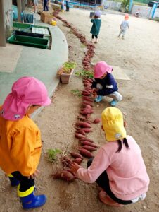 沢山のサツマイモが収穫できました。みんなで園庭まで運びます。