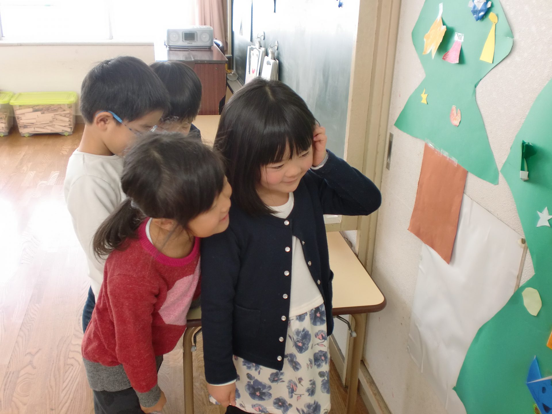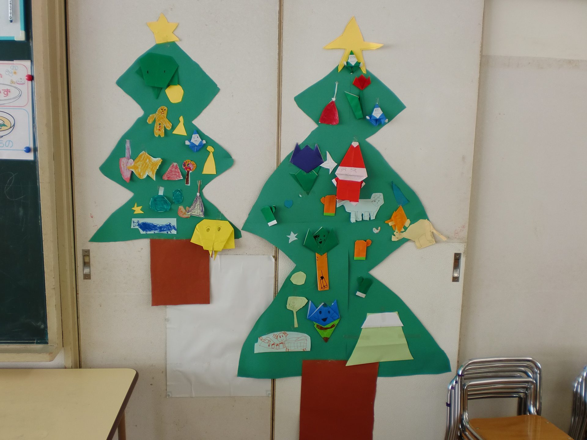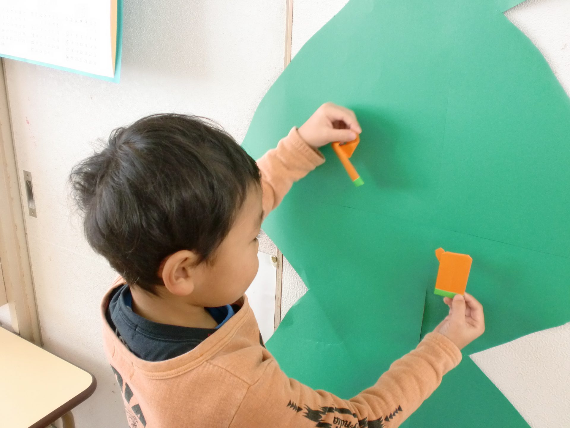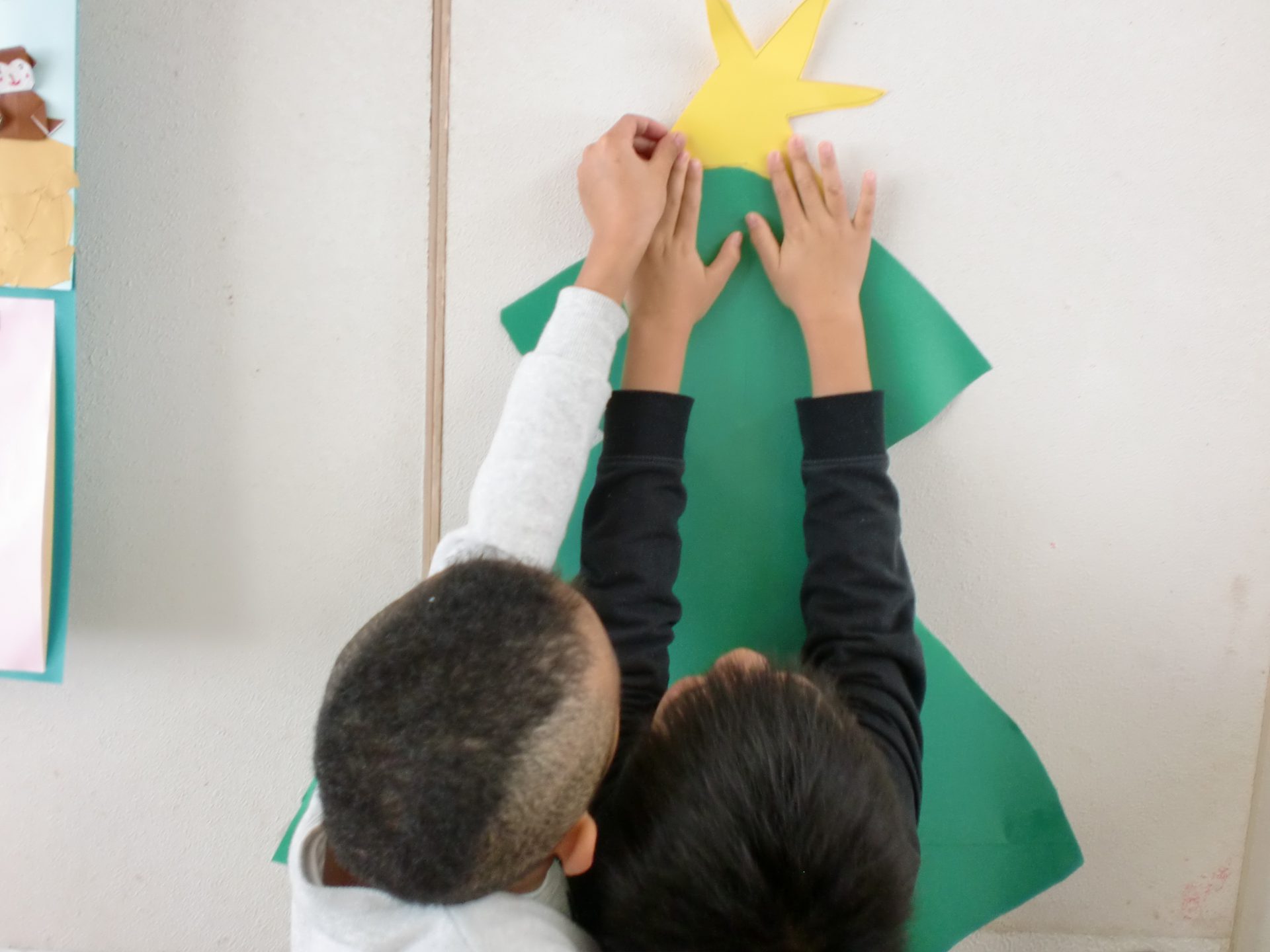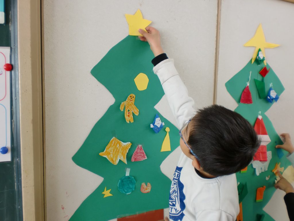 少し高いところは椅子を使ったり、友達と協力して貼ったりしながら、できあがっていくツリーを楽しみにしている様子でした。