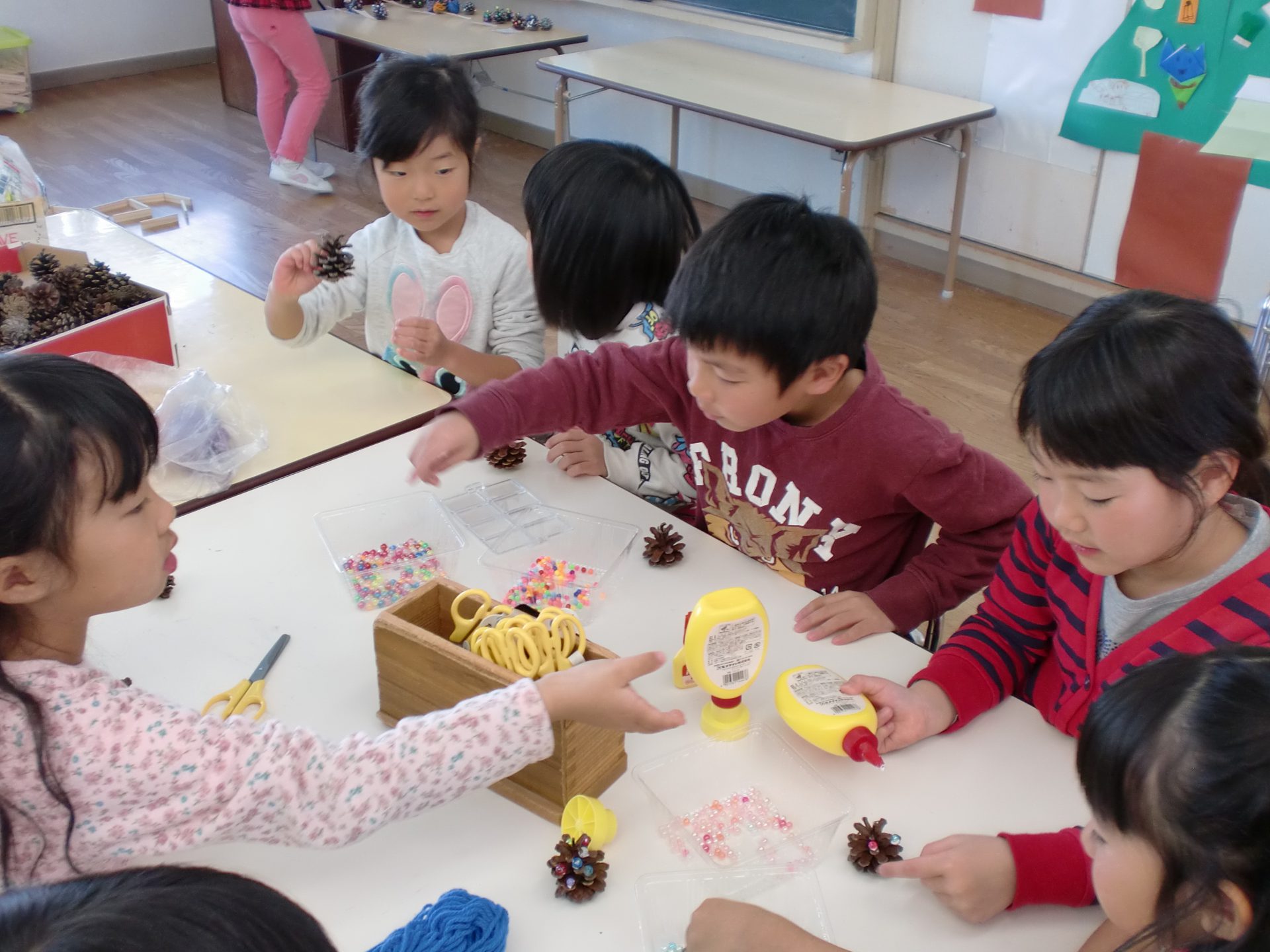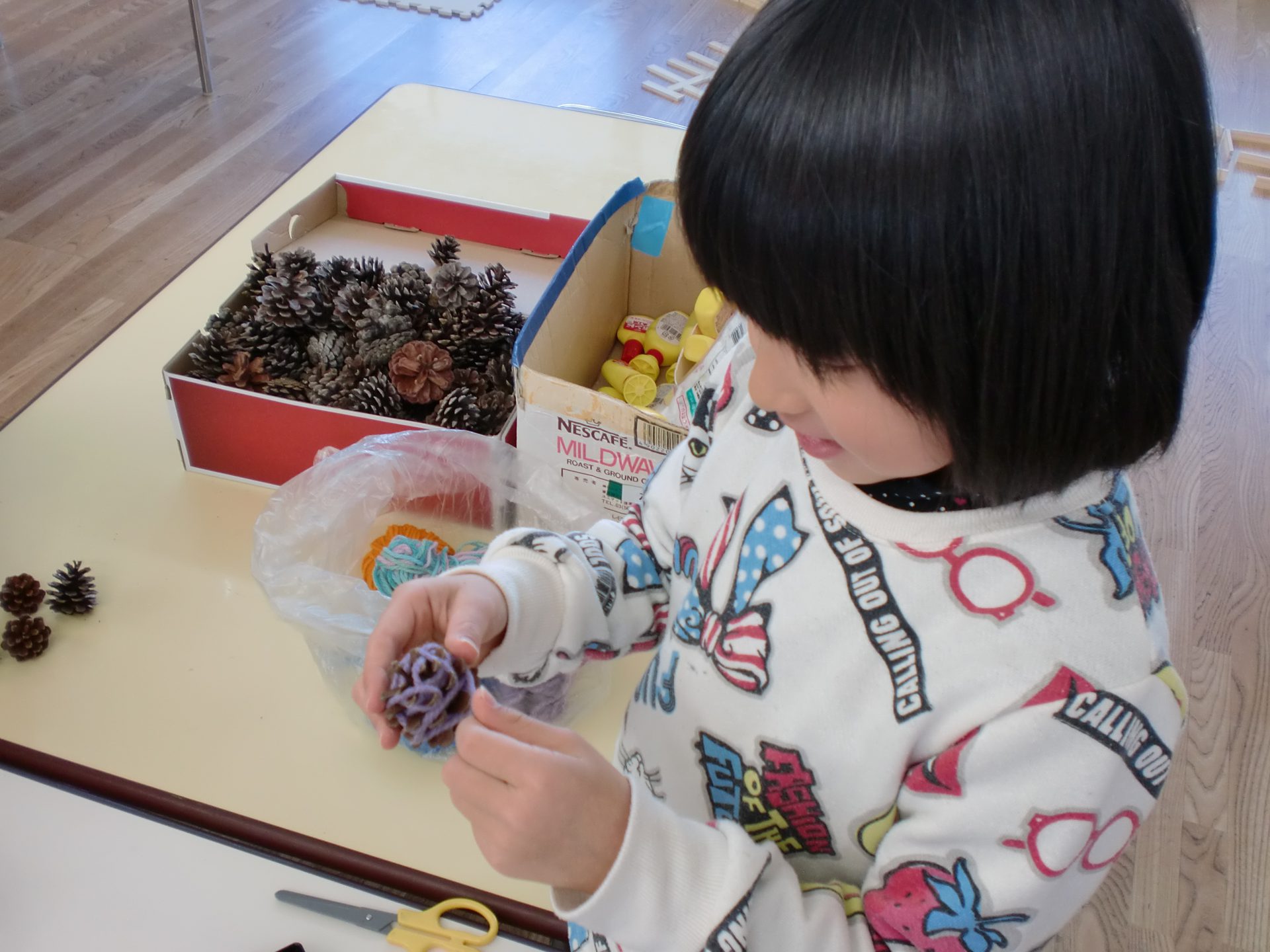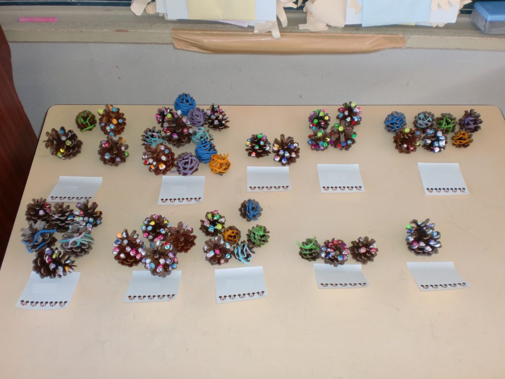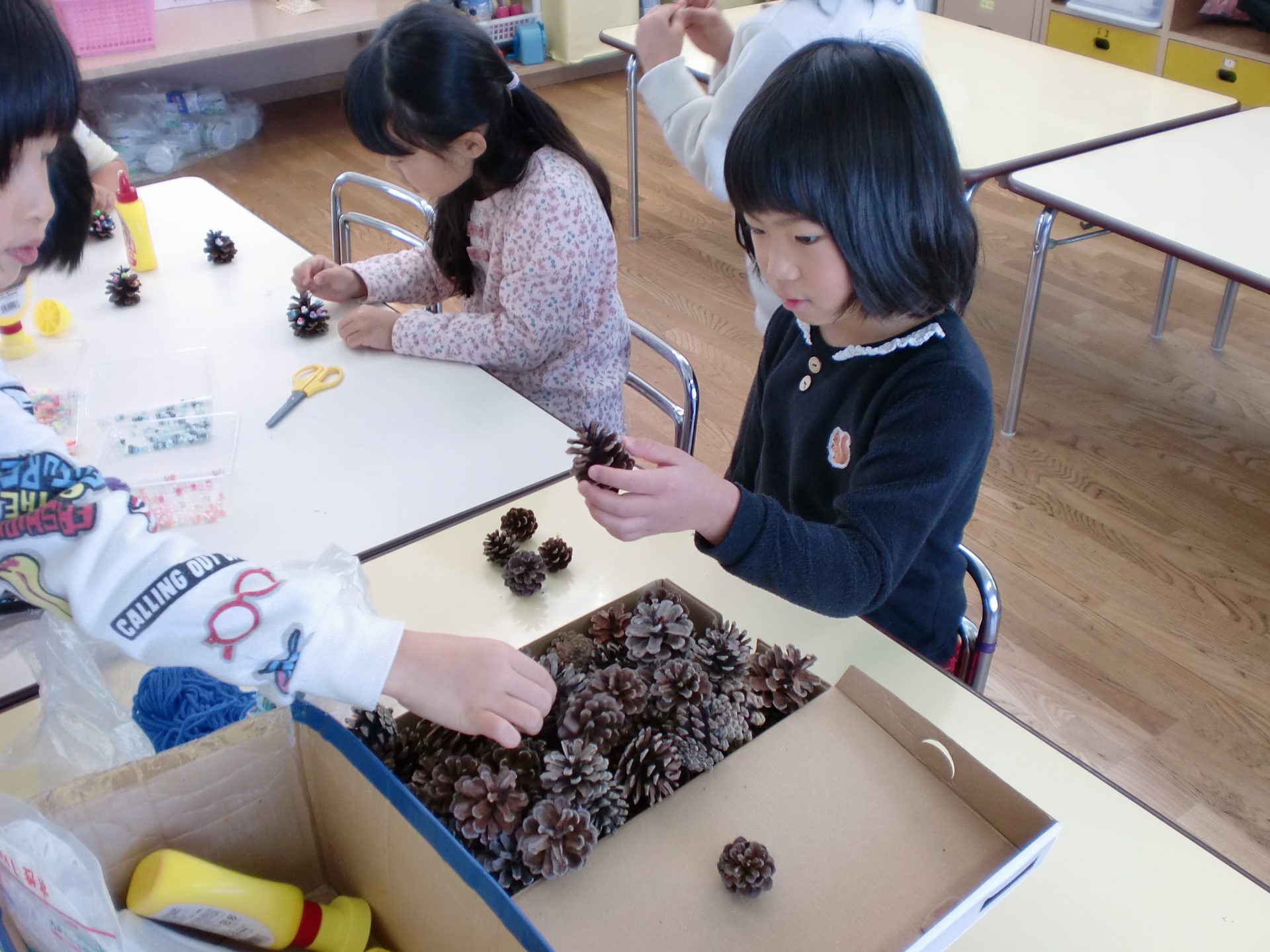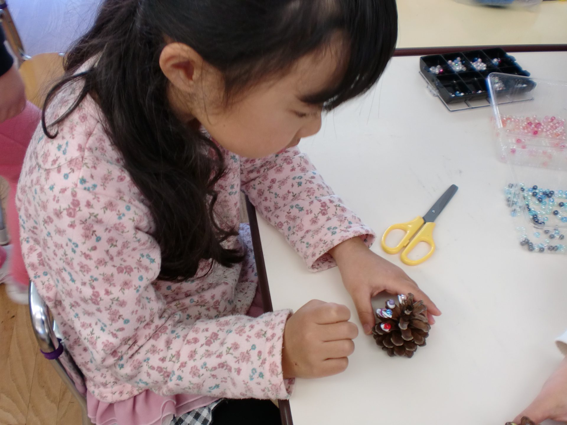 この他にも、松ぼっくりに飾り付けをし、小さなクリスマスツリーもたくさん作りました。