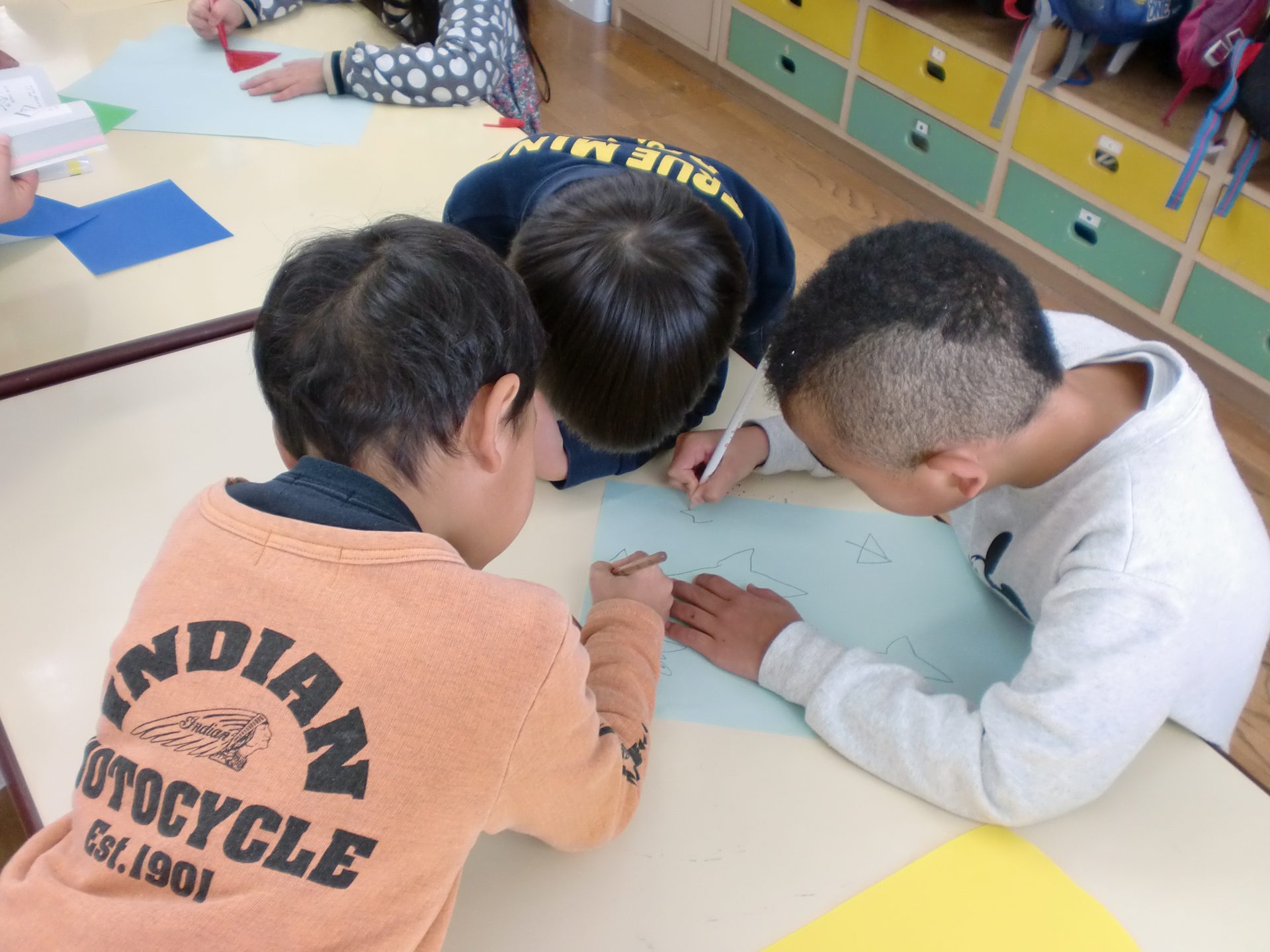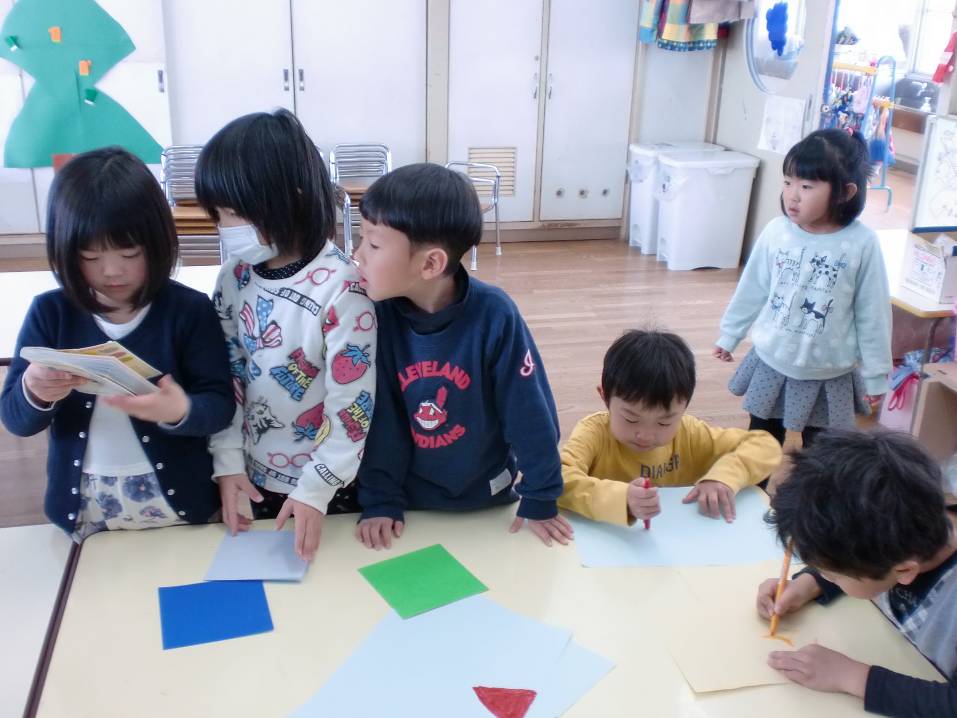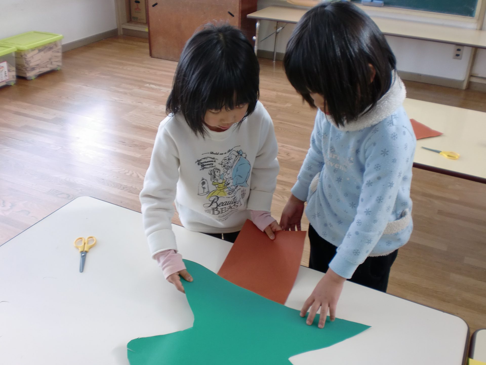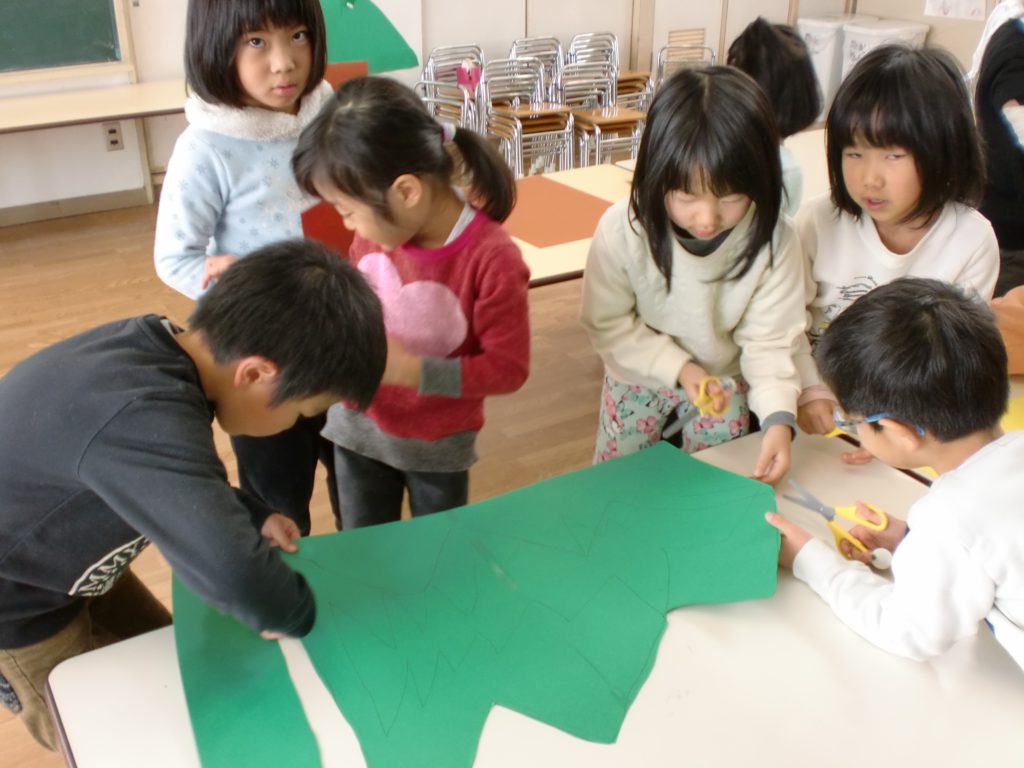 大きさ、形など全て自分たちで決め、「ぼくはこっちから切るね」と分担しながらどんどん作っていき、ツリーの形ができあがると「どんな飾りを作ろうかな〜」と折り紙の本を見たり、画用紙を使って自由に作ったりしていました。