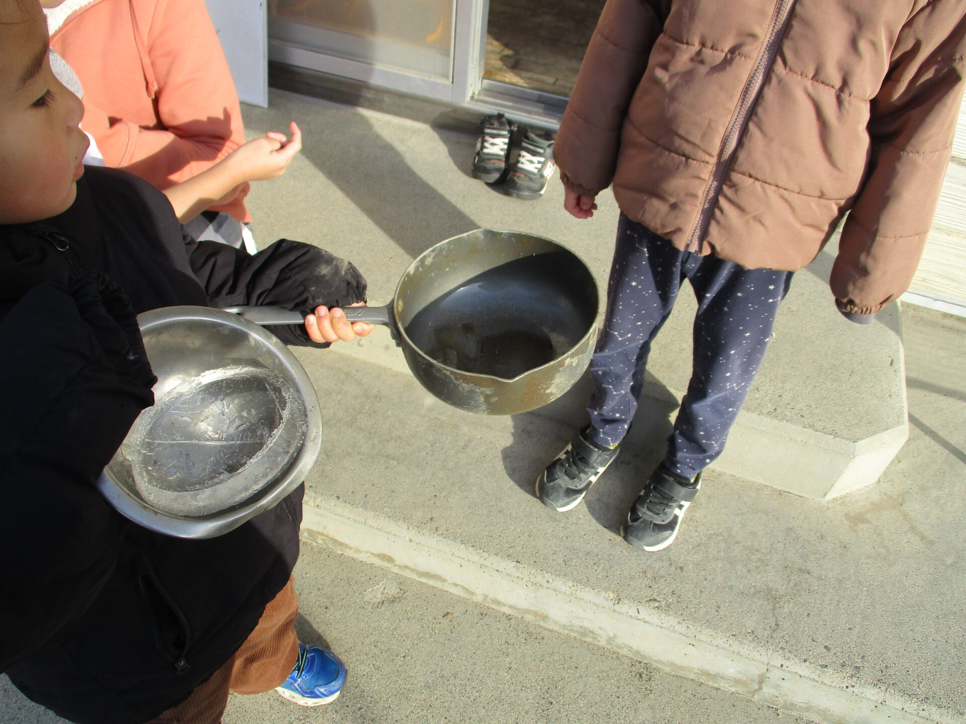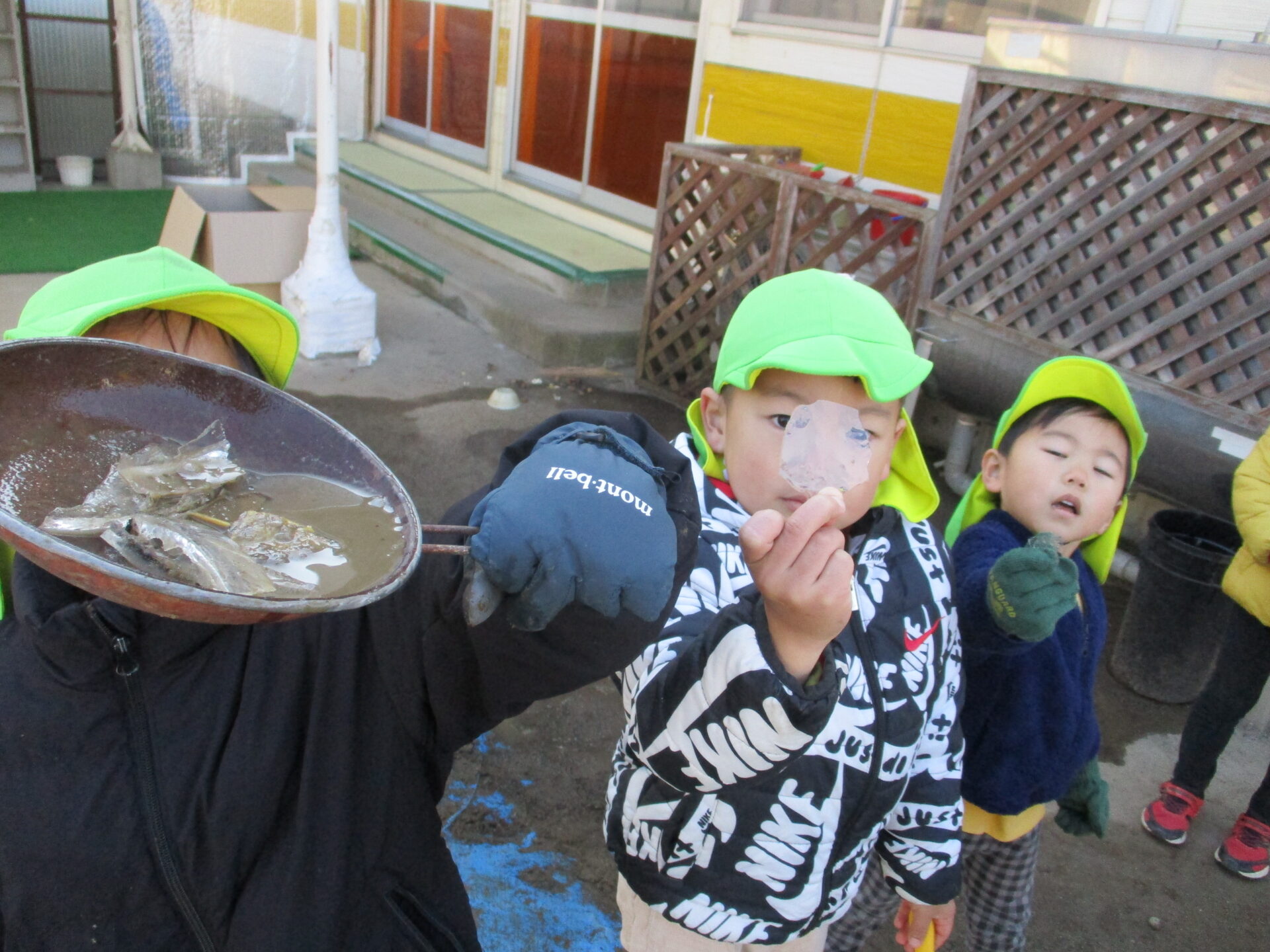 朝、園庭に出ると氷ができていることに気がつきました。