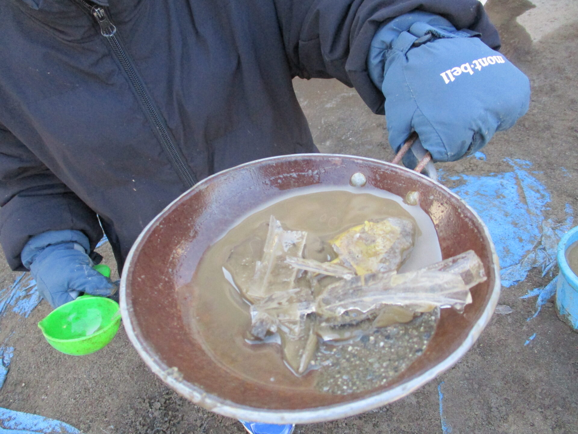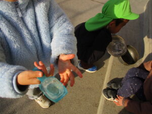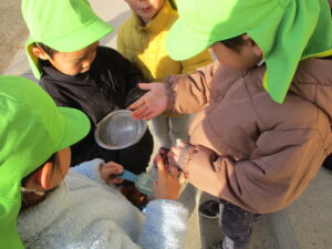 氷の冷たさに気づき、手袋をする子や袖を長くして持つ子など工夫する姿が見られました。