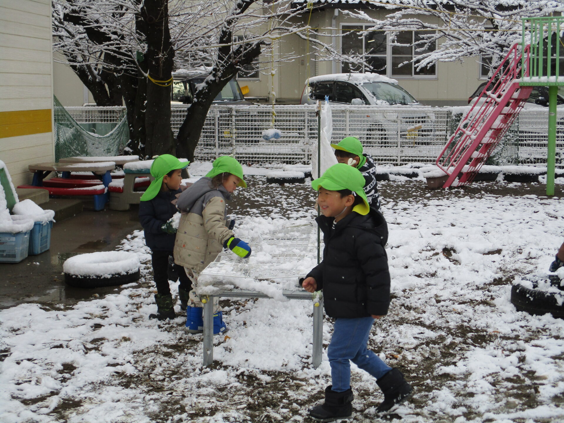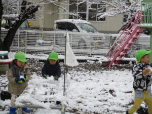 また、次の日には雪も降りました。大興奮で登園してくる子どもたち。「外行きたい!」とキラキラした表情を浮かべています。