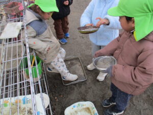 冬の自然物に触れたり、様々なことを感じたりする子どもたちです。