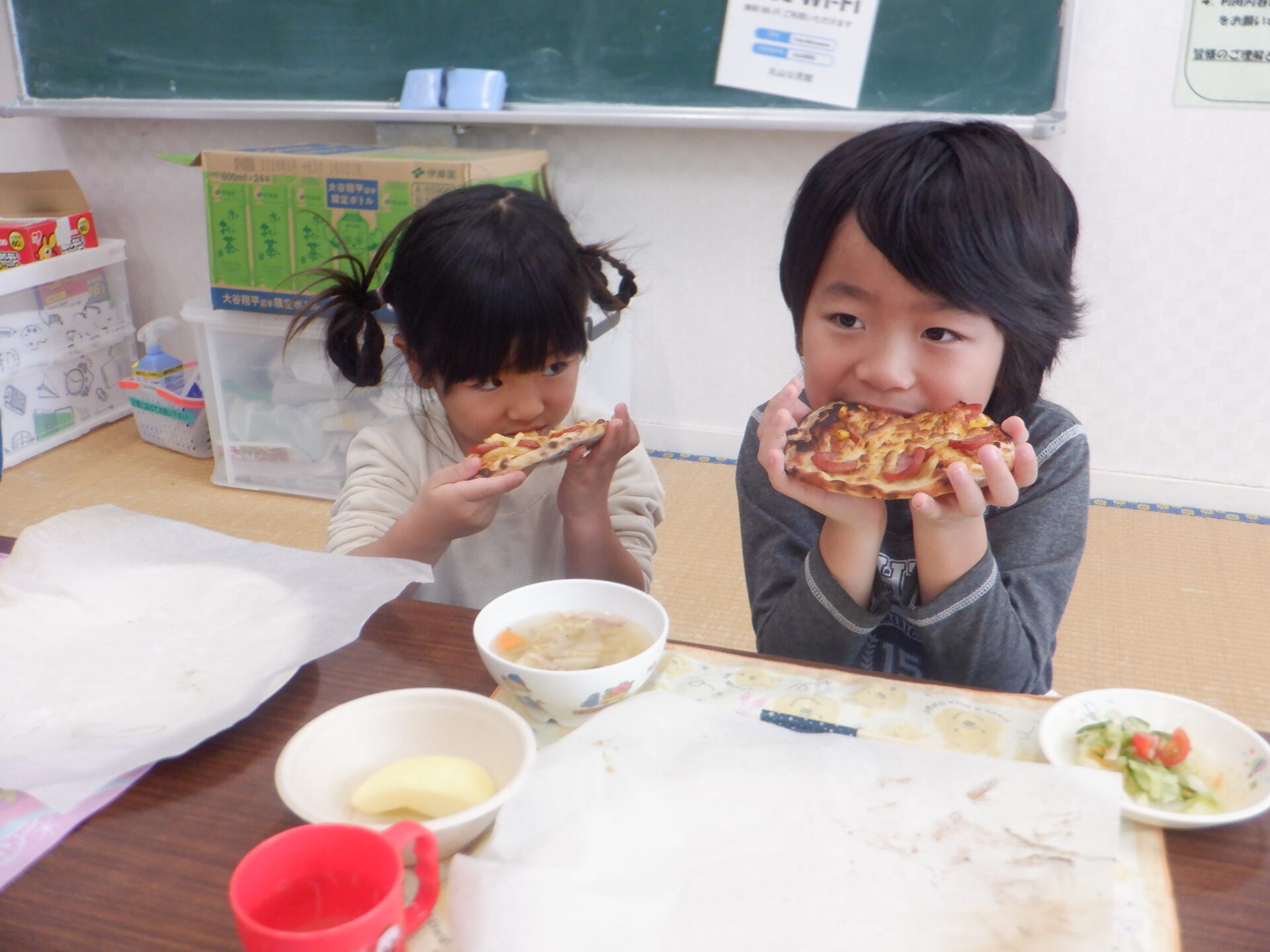 おいしくピザが焼き上がり、保育園から運んだ給食と一緒に大きな口でパクパク食べました。