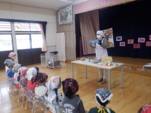 市役所の栄養士の菅沼さんがピザに使う材料を一つ一つ見せて説明しながら、生地作りの工程を見せてくれました。