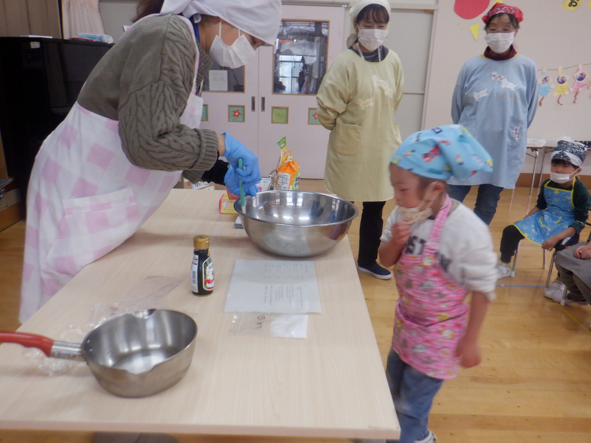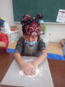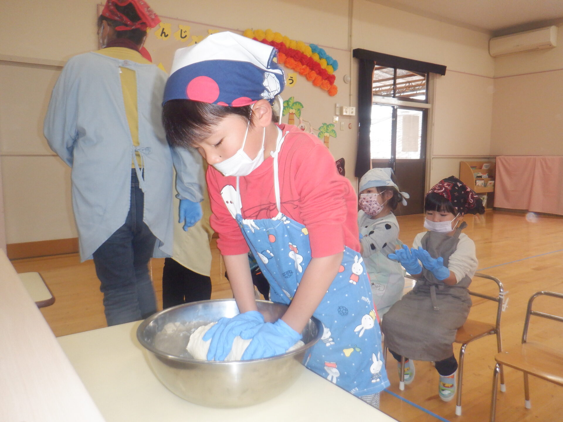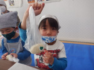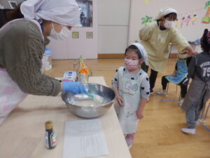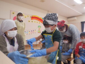 材料が全部入ると、つぎはこねていきます。こども達も順番にお手伝いコネコネ・・・力をいれてがんばります。