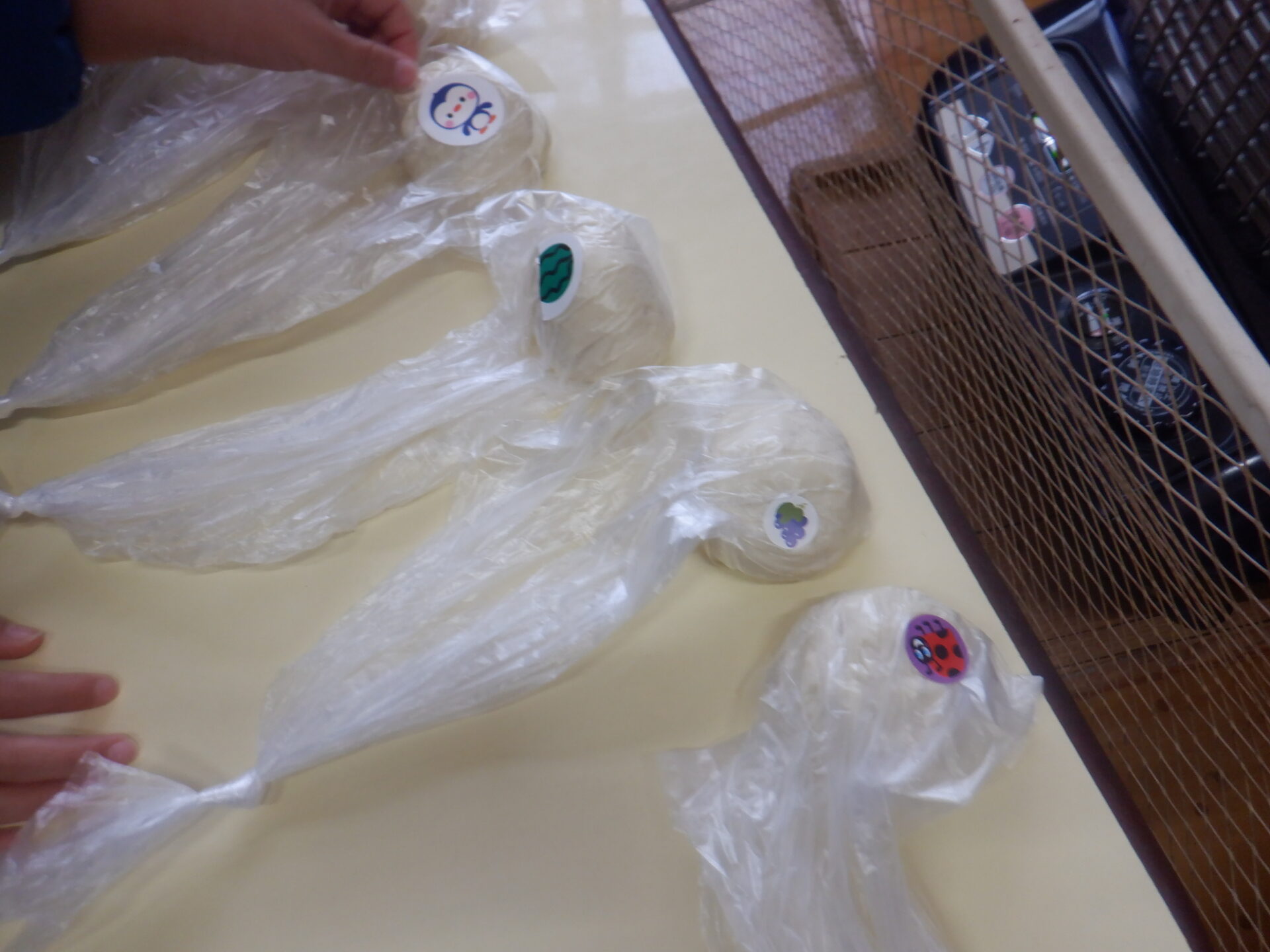 発酵が進むように80gずつビニール袋に入れてストーブの近くで温めます。